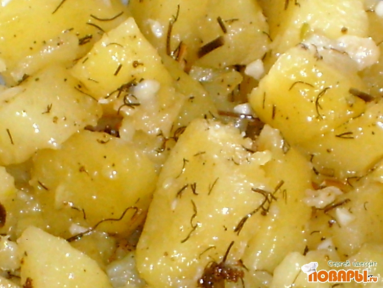 Когда масло растопится и картофель достаточно прогреется добавляем мелко порезанный чеснок и если сушеные травки, то и их. Если свежие или свежезамороженные, то минут за 5 до конца готовки.