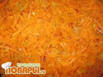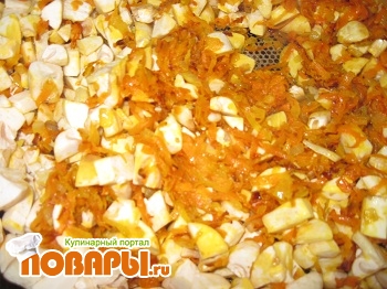 Грибы промыть и нарезать кубиками. Морковь обчистить и натереть на крупной терке. Лук почистить и мелко нарезать, пасировать на жире, до прозрачности. Добавить морковь, немного обжарить