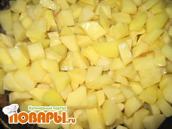 Картофель обчистить и нарезать кубиками среднего размера. Немного обжарить на сковороде до золотистой корочки.