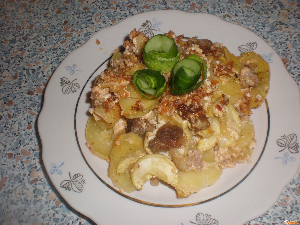 Картофель, кабачки очистить, нарезать кружочками. Поджарить на растительном масле луковицу до золотистого цвета, добавить мясной фарш, соль, перец по вкусу. Тушить до готовности.