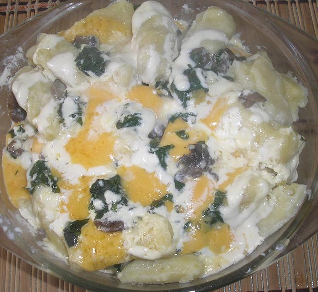 Отварить ньокки в подсоленной воде по 2 минуты (готовы, когда всплывут). Выложить шумовкой в форму, накрыть. Кастрюлю с отваром оставить на огне. Шпинат вымыть и выложить в кастрюлю, где варились ньокки. Через минуту откинуть на дуршлаг. встряхнуть.