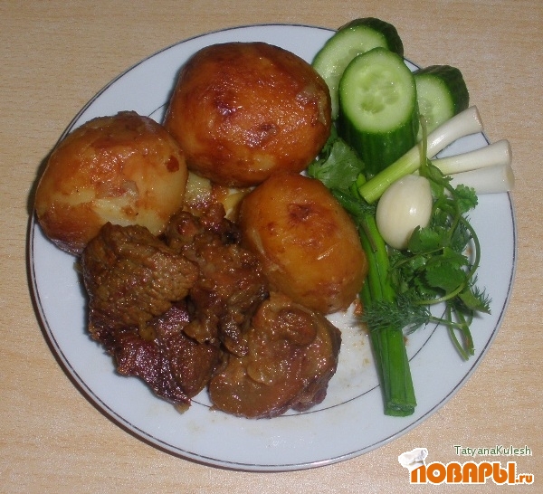 После выложить картофель на мясо и томить под крышкой ещё 20 минут.