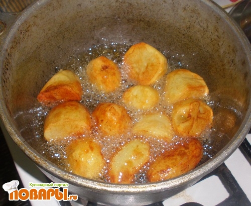 Раскалить растительное масло в казане или в кастрюле с двойным дном. Картофель, диаметром 5-7 см, почистить и целиком обжарить со всех сторон на большом огне до хрустящей корочки. После выложить обжаренный картофель в любую другую посуду и дать маслу в казане немного остыть.