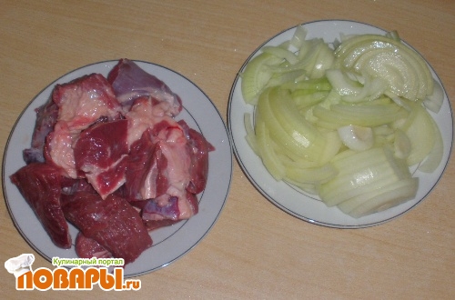 Мясо положить в казан и обжаривать на большом огне, а затем так же выложить. Обжарить в казане лук, добавить к нему мясо и немного воды. Накрыть крышкой и томить на слабом огне 30 минут.