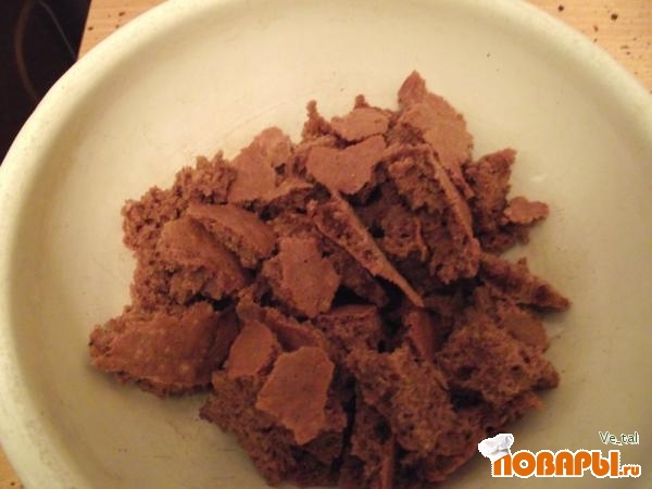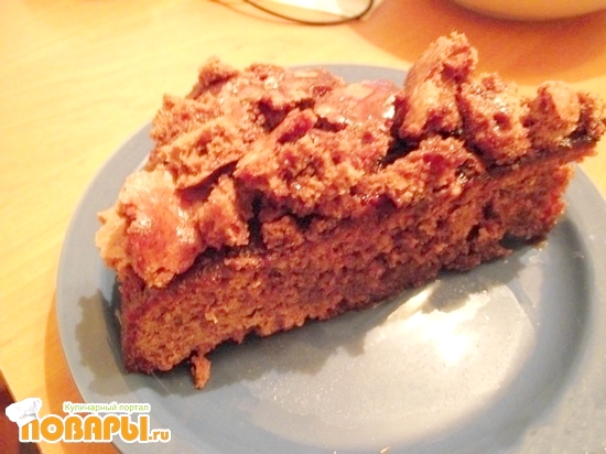 Теперь при помощи половника заливайте кекс шоколадным соусом, после срезанную верхушку с кекса раскрошите над кексом и залейте оставшимся шоколадным соусом.