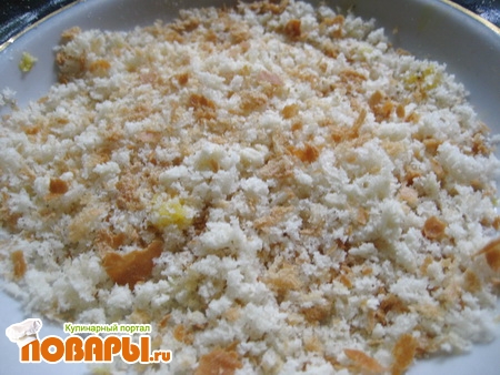 Батон натереть на крупной терке. Можно использовать и сухари, но с батоном получается замечательнейшая корочка