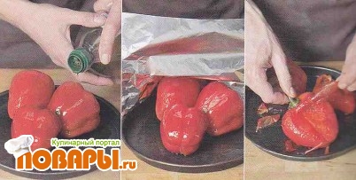Тем временем положите перцы в форму для запекания, сбрызните небольшим количеством масла, накройте фольгой и поставьте в разогретую до 220 °С духовку на 20 мин. Не снимая фольги, дайте перцам остыть. Затем снимите с них кожицу, удалите сердцевину, мякоть нарежьте.
