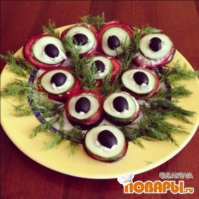 Помидоры и огурчики нарезать небольшими кружочками. Маслины нарезать пополам, мелко порубить чеснок и укроп.