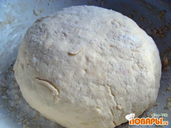 Замешиваем тесто. Для этого муку смешиваем с разрыхлителем, добавляем тертый на крупной терке маргарин и сметану. Получается тяжеленький колобок. Тесто временно отправляем в холодильник.