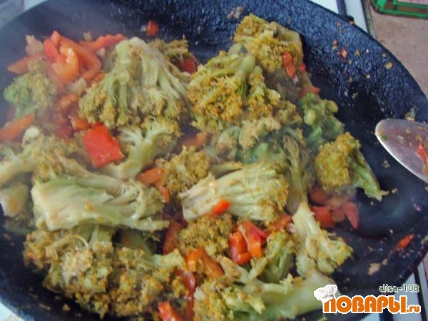 На растительном масле поджариваем перчик, в течении 5-7 минут, добавляем брокколи и примерно протушиваем 7 минут.