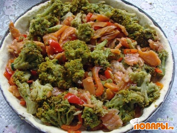 Готовим начину. Перец и красную копченую рыбу нарезаем кубиками, отваренное брокколи делим на соцветия.