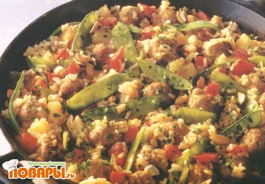Фрикадельки из говяжьего и свиного фарша прекрасно дополняет рис в кисло-сладком соусе. При желании можно заменить обычный рис кускусом или булгуром. Пикантные фрикадельки и нежный рис в живописном обрамлении стручков фасоли и сладкого перца пропитаны кисло-сладкой смесью ананаса, свежего имбиря, хереса и соевого соуса.