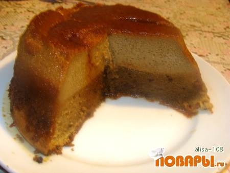 Все это сооружение отправляем в духовку, предварительно нагретую до 180 градусов. Верх бизкофлана надо прикрыть фольгой. Выпекается (по крайней мере у меня) долго, примерно час-полтора. После выпекания, я просто выключила газ в духовке и оставила еще на какое-то время остывать.