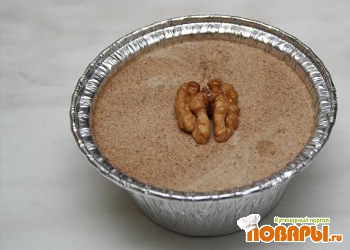 Пропорционально раскладываем крем по формочками и ставим в холод для затвердения. Кофейный крем украшаем орешками, посыпаем сахарной пудрой. К столу блюдо подается холодным.