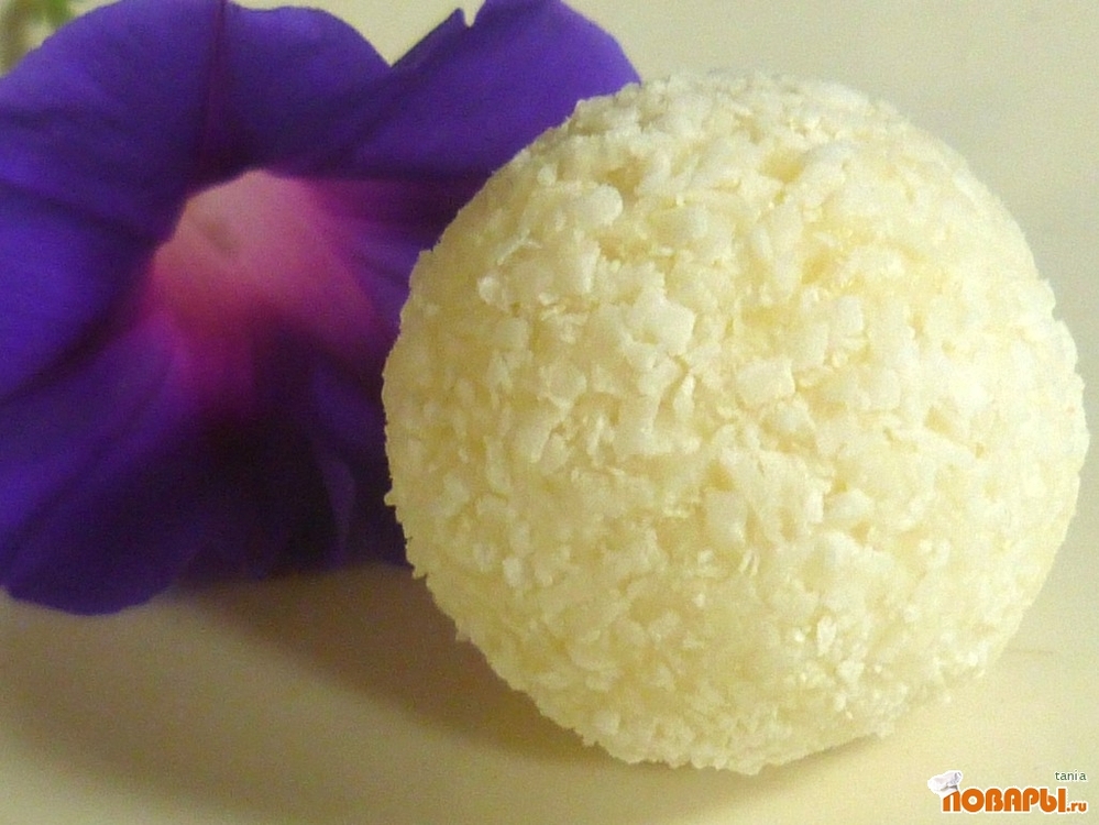Вынуть кокосовую массу из холодильника, брать немного массы, делать лепешечку, обволокнуть шоколадный шарик, сформировать шарик побольше, размером с грецкий орех. Когда все шарики будут готовы, спрятать их на пол часа в холодильник, они прилично затвердеют, тогда растопить остальной шоколад