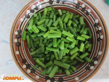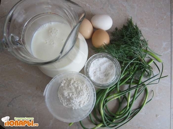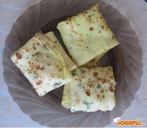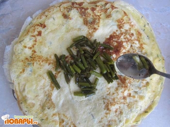 Отдельно жарим блинчики из готового теста. Когда блинчики остынут, на середину выкладываем поджаренные стрелки.