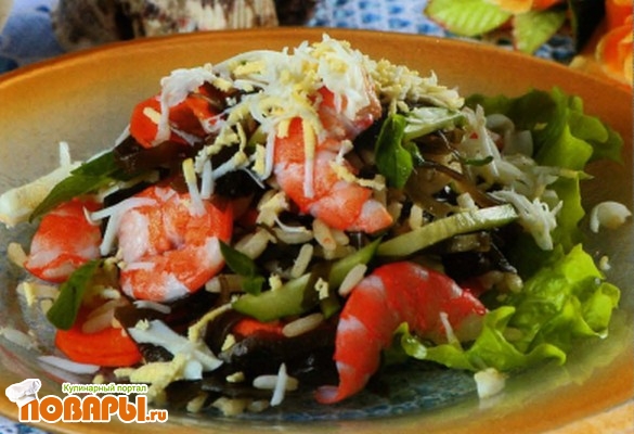 В глубоком салатнике соединить рис с морской капустой, добавить морковь вместе с соевым соусом, креветки и огурец, по вкусу посолить и поперчить. Заправить салат майонезом, смешанным с аджикой. Выложить салат горкой на тарелку посыпать тертым яйцом, украсить зеленью.