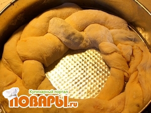 Выложить косичку в круглую форму, смазанную сливочным маслом и оставить на 15 - 20 минут для расстойки теста.