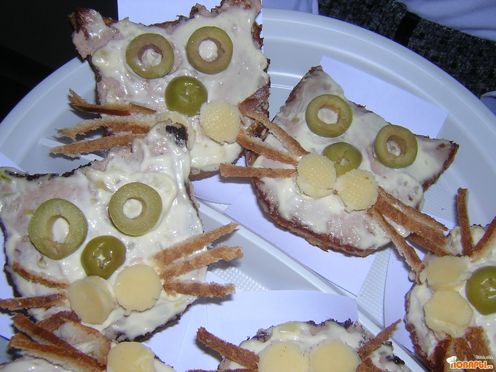 Сделать "глаза" и нос из оливок, «щечки» из сыра, а «усы» из корочки хлеба.
