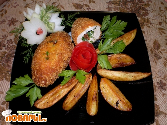 В моем случае в качестве гарнира я использовала молодой картофель, запеченный в духовке вместе с кожицей и оформила цветами из помидора и репчатого лука, украсила свежей зеленью укропа и петрушки. Оригинальность этого блюда заключается в том, что при нарезке из котлет вытекает растопленное сливочное масло с зеленью (своего рода соус). Хрустящая корочка котлет совместно со сливочным маслом и зеленью - и Вы получите истинное наслаждение от этого дуэта!!!