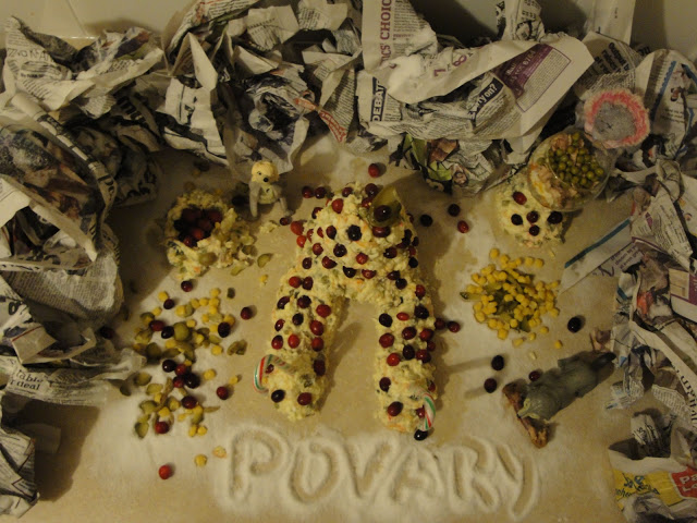 Для него мы строим кружок небольшой высоты и ложим в него брюкву. За колодцем спрятался шустрый волчонок, который сделал беспорядок вдоль замка. Для безпорядка ипользуем огурчики мелко нарезанные соломкой, как и оливки, кукурузу, наши бусинки из клюквы. Последний штрих - это, берем сахарную пудру и окуратно все засыпаем, - это снежок. И получается замок среди гор и скал, где живут волченки и мишутка и кто-то еще в самом замке!