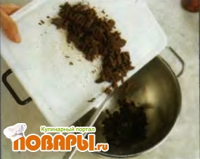 Порежьте ножом шоколад на чистой пластиковой доске для резки мяса или измельчите его на крупной терке. Соберите шоколад в стальной либо медной миске. Округлая форма такой миски является идеальной для расплавления шоколада и убережет его от пригорания.