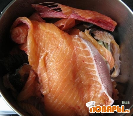 Для приготовления этого легкого в исполнении, густого супчика нам потребуется кусочек лосося: это может быть, как в моем случае, суповой набор (голова, плавники, хребет, хвост, оставшиеся после разделки рыбы), либо обычный стейк.