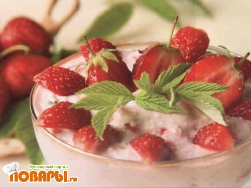 К массе добавьте оставшуюся клубнику, нарезанную кубиками. При подаче крем уложите в вазочки, оформите клубникой и оставшейся зеленью.