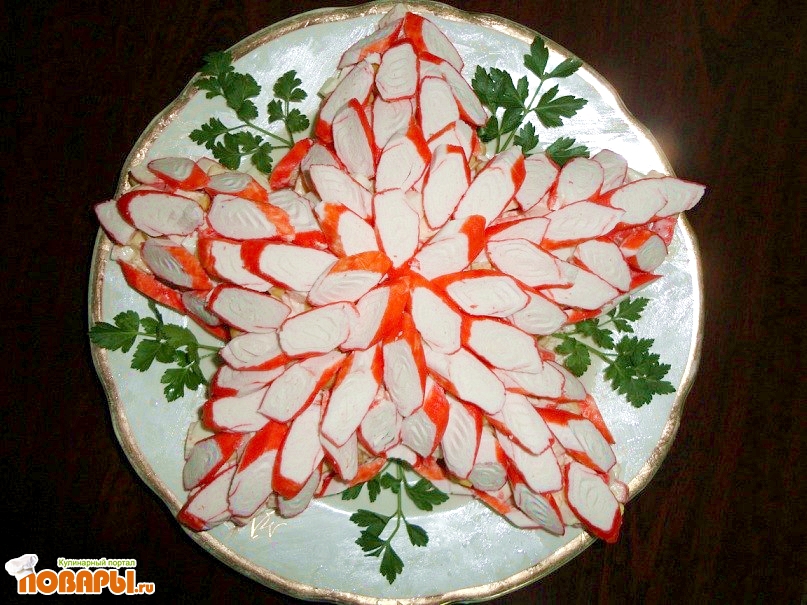 Выложить на блюдо в виде звезды и сверху украсить крабовыми палочками. По желанию украшаем зеленью. Даем настоятся минут 30 в холодильнике и блюдо готово!