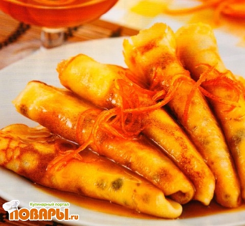 Полить каждый блинчик соусом с одной стороны, свернуть сначала пополам, потом конусом (соус должен быть внутри). Разложить блинчики на сковороде плотно, один к другому. Поставить сковороду на огонь.