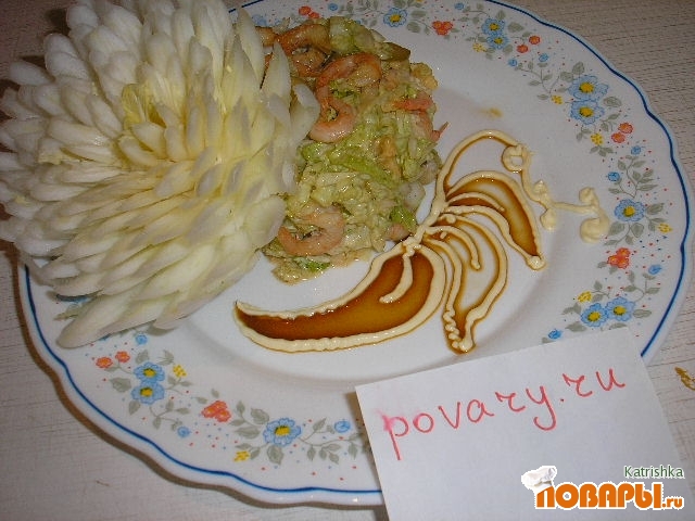 Все смешать.Растопить сыр и полить им салат.Смешать оливковое масло и соевый соус.Полить соусом салат.Украсить майонезом,соусом и цветком из китайской капусты.