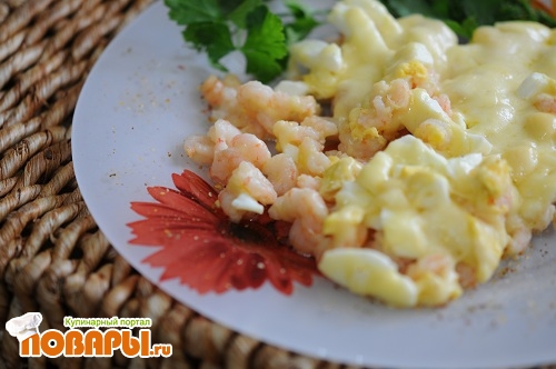 Яйца отвариваем заранее, очищаем их и мелко режим. Выкладываем порезанные яйца поверх креветок- не мешая. Яйца посыпаем горчичным порошком.