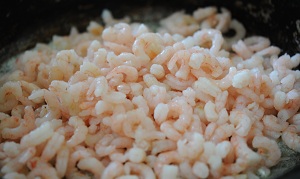 Как только масло растопилось, выкладываем в сковородку креветки- обжариваем, помешивая. Минут 3-5