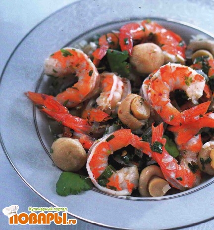 Разложите креветки вместе с соусом на тарелки, посыпьте приправой и подавайте немедленно. Маслом каждый может приправить блюдо по собственному вкусу.