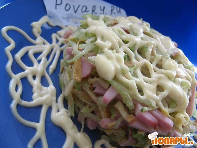 Зеленую редьку натереть соломкой,порезать ветчину соломкой,из яиц спечь 4-5 блинчиков и порезать их соломкой тоже.Все смешать.добавить соль,перец по вкусу.смешать с майонезом чуток и нанести сверху сетку из майонеза,кружевами.