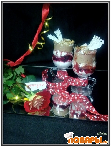 В блендере взбить 100 г творожка со сгущеным молоком, добавить растопленный белый шоколад и растворенный желатин. Дать остыть и немного зажелироваться чтобы можно было порционно ложкой выкладывать в чаши.