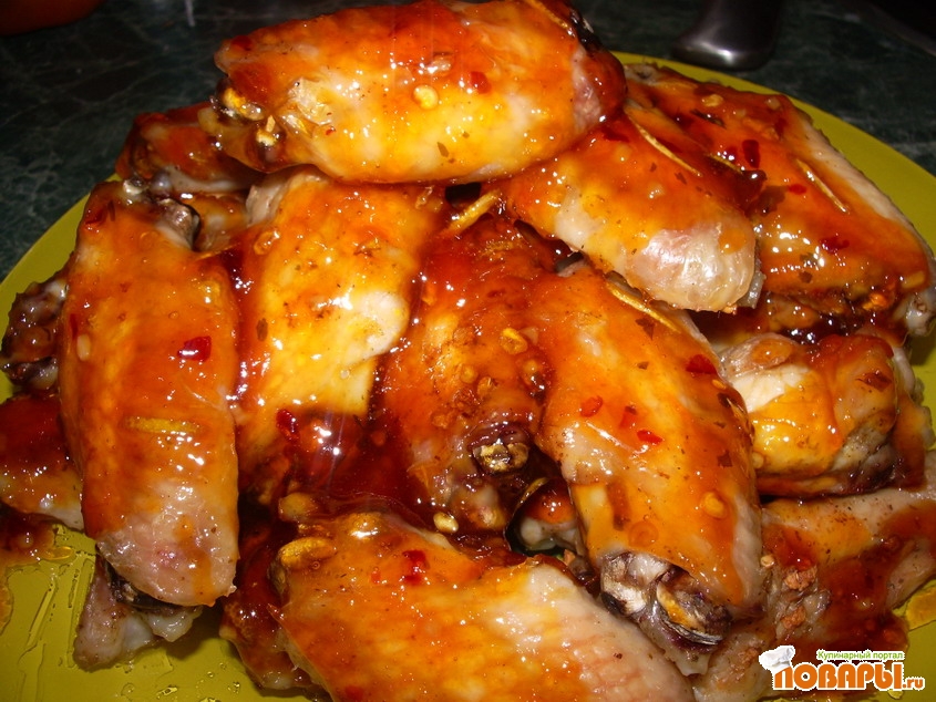 Крылышки режем, солим, перчим, выдавливаем чубчик или больше (по вкусу ) чеснока.Складываем все это в пакетик и на час в холодильник мариноваться.