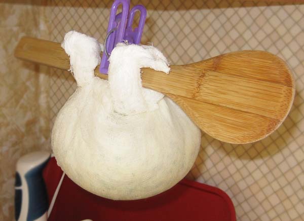 Все, откидываем массу на сито, выстеленное марлей, отжимаем, прессуем и подвешиваем стекать и остывать.