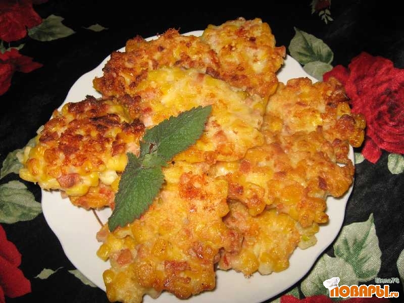Лук мелко порезать. Смешать его с соком от кукурузы, мукой и яйцом, посолить. Потом добавить мелко порезанную колбасу, потертый сыр и кукурузу. Все перемешала и дала немного постоять.