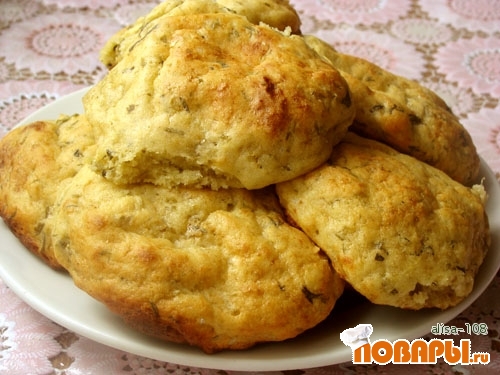 Смешать муку кукурузную с пшеничной, добавить разрыхлитель, соль. Творог хорошенько растереть с кефиром и добавить к мучной смеси. В конце добавить свежий укроп. Выпекать в предварительно нагретой духовке при 180 градусах.