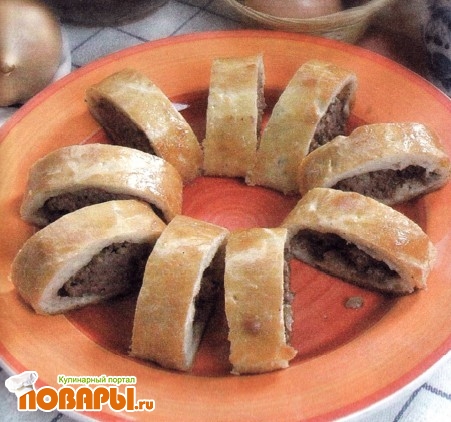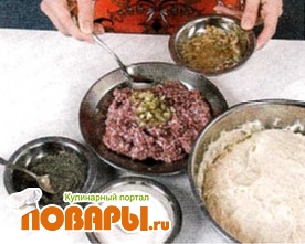 Начинка: лук очистить, нашинковать и обжарить на растительном масле. Добавить его в фарш, посолить, поперчить и тщательно вымешать.