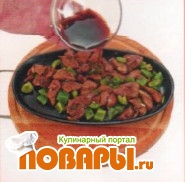 В сковороде разогреть растительное масло, обжарить печень в течение 3-4 минут до появления коричневого оттенка. Добавить сладкий перец, лук, чеснок и имбирь, обжаривать ещё 1-2 минуты.