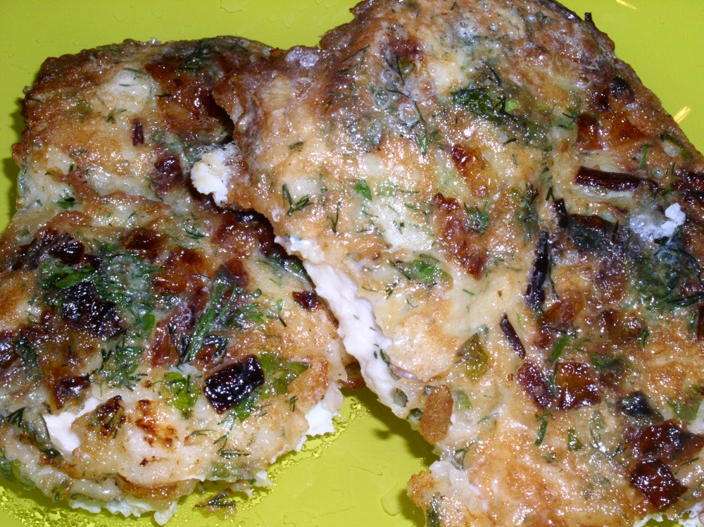 Взбейте яйцо, добавьте пассерованный лук, рубленую зелень, соль. Маринованные куски курицы запанируйте в муке, обмакните в яйцо с луком и обжарьте на раскаленной с маслом сковороде. Оставшимся яйцом залейте курицу и запекайте в духовке.