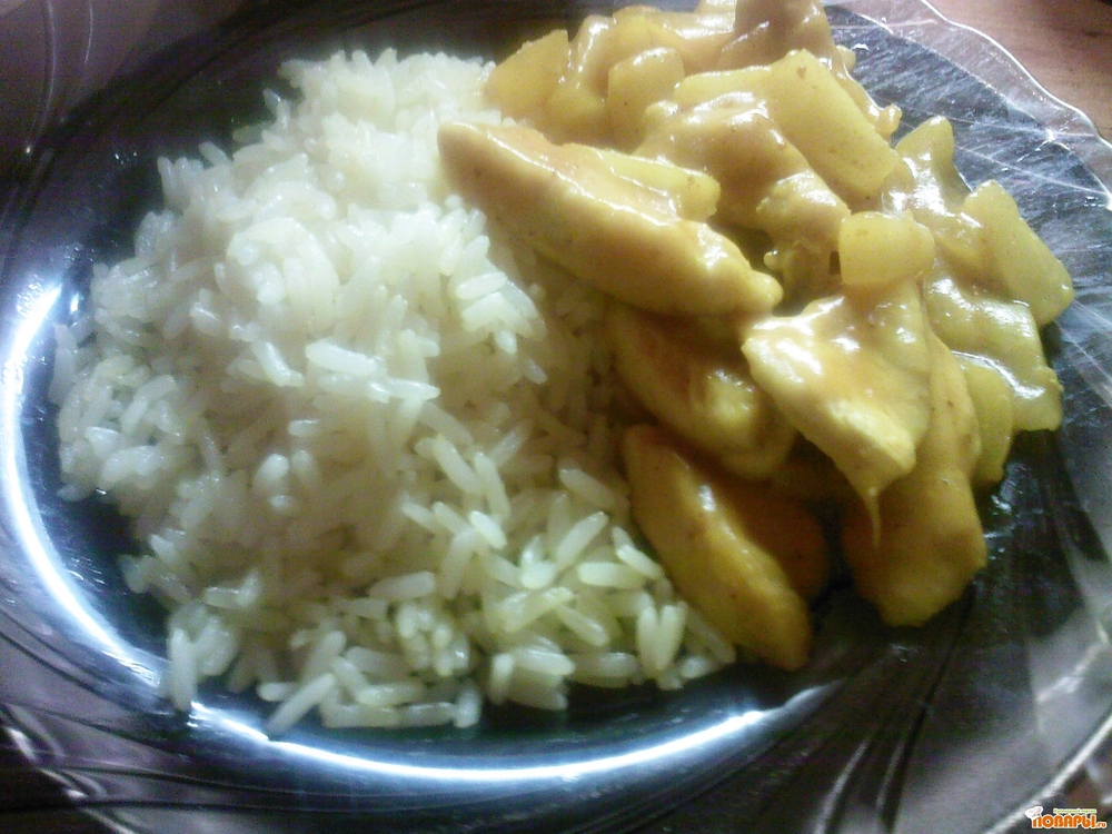 ГОТОВИМ СОУС КАРРИ: Сироп от консервированных ананасов слить. Добавить в сироп приправу карри и крахмал. Размешать и вылить в маленькую НЕ разогретую сковороду. На среднем огне довести до загустения, непрерывно помешивая. Затем снять с огня.