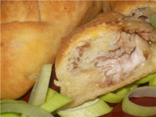 Тесто делим на 4 части, раскатываем довольнотонко.Выкладываем дорожку лука, на нее колбаску нашу и сверху еще лук.Пеленаем ее.
