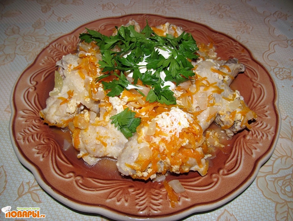 Закрыть куриные крылья оставшейся смесью лука и моркови, добавить чеснок.