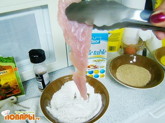 Кусочки обмакнуть в муке, затем взбить яйца в неглубокой тарелке, обмакнуть кусочки - удобно использовать специальные щипцы.