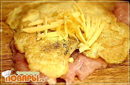 Готовую яичницу выложит на куриное филе. Посыпать специями по желанию, я брала черный перец. Затем выложить немного тертого сыра. Свернуть в рулет.