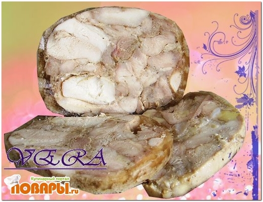 Воду доводим до кипения и варим 1 час. Снимаем груз и вытаскиваем пакет из воды. Охлаждаем. Перед употреблением вынимаем рулет из пакета и нарезаем.