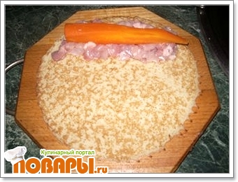 Я начала со спины, снимаем аккуратно, стараясь не повредить кожу. С тушки срезаем грудку и сильно отбиваем. Остальное мясо срезаем и режем на мелкие кусочки. На блин выкладываем измельченное мясо и вареную морковь, сворачиваем в тугой рулетик.